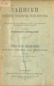 Том IV: Видавництво присьвячене науці і письменству україньскоруского народу / Впорядкував Олександер Барвіньский. – Львів, 1894. – [1] + 200 с.; зміст І та II томів укр. та нім. мовами, с. 2 обкл.; титул укр. та нім. мовами, с. 1 ненум.; зміст III та IV томів укр. та нім. мовами, с. З обкл.; адреса Товариства укр. та нім. мовами із закликом до співпраці у виданні, с. 4 обкл.