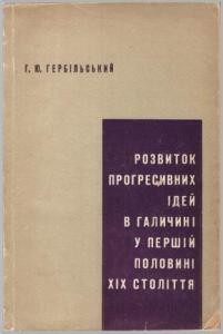 Гербільський, Григорій Юлієвич., Розвиток прогресивних ідей в Галичині у першій половині XIX ст. (1848 р) / Г. Ю. Гербільський . – Львів; Львів : Вид-во Львівського ун-ту, 1964 . – 251 с., Книга є першим у радянській історичній літературі дослідженням одного з важливих питань історії України. Головну увагу в роботі звернено на боротьбу передової суспільної думки проти реакційної. Перший розділ книги присвячений селянському антифеодальному руху і формуванню селянської суспільної думки. У другому і третьому розділах характеризується діяльність тих українських і польських учених, які, не займаючи революційних позицій, виступали у своїх творах проти клерикально-шляхетської ідеології. Важливе місце в роботі займає характеристика діяльності української просвітительської групи «Руська трійця». Окремий розділ присвячено галицькій революційній публіцистиці 30—40-х років., Книга розрахована на викладачів і студентів історичних факультетів, а також може бути використана усіма, хто цікавиться історією України.