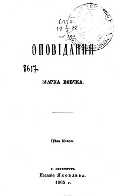 Оповідання Марка Вовчка. СПб.: Изд. Яковлева; [Дpук. П. А. Куліша], 1865. 145 cтор., До збірки увійшли: «Кармелюк», «Невільничка», «Дев’ять братів та десята сестриця Галя», «Ведмідь» (пізніша назва «Сестричка Мелася»).