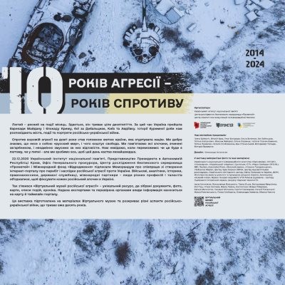 Лютий – рясний на події місяць. Здається, він триває ціле десятиліття. За цей час Україна пройшла барикади Майдану і блокаду Криму, бої за Дебальцеве, Київ та Авдіївку. Історії буремної доби нам розповідають міста, події та портрети російсько-української війни., Спротив ворожій агресії на довгі роки став головною метою країни, яка згуртувала націю. Ми добре знаємо, що несе з собою «русский мир», і чого коштує свобода. Ми пам’ятаємо всі злочини, вчинені загарбником, і неодмінно змусимо за них відповісти. Нам невідомо, коли переможемо: чи це буде в лютому, чи у липні – але ми зробимо все, щоб цей день настав якнайшвидше., 22.12.2020 Український інститут національної пам’яті, Представництво Президента в Автономній Республіці Крим, Офіс Генерального прокурора, Центр дослідження безпекового середовища «Прометей» і Міжнародний фонд «Відродження» підписали Меморандум про співпрацю зі створення інтернет-порталу про перебіг і наслідки російської агресії проти України. Військові, аналітики, історики, правозахисники, державні службовці, міжнародні партнери – люди різних професій і талантів об’єдналися, щоб фіксувати кожен російський злочин в Україні., Так з’явився «Віртуальний музей російської агресії» – унікальний ресурс, де зібрані документи, фото, карти, описи подій, хроніка. Надана експертами та перевірена органами влади інформація наноситься на карту й таймлайн порталу., Ця виставка підготовлена на матеріалах Віртуального музею та розкриває різні аспекти російсько-української війни, що триває вже десять років.